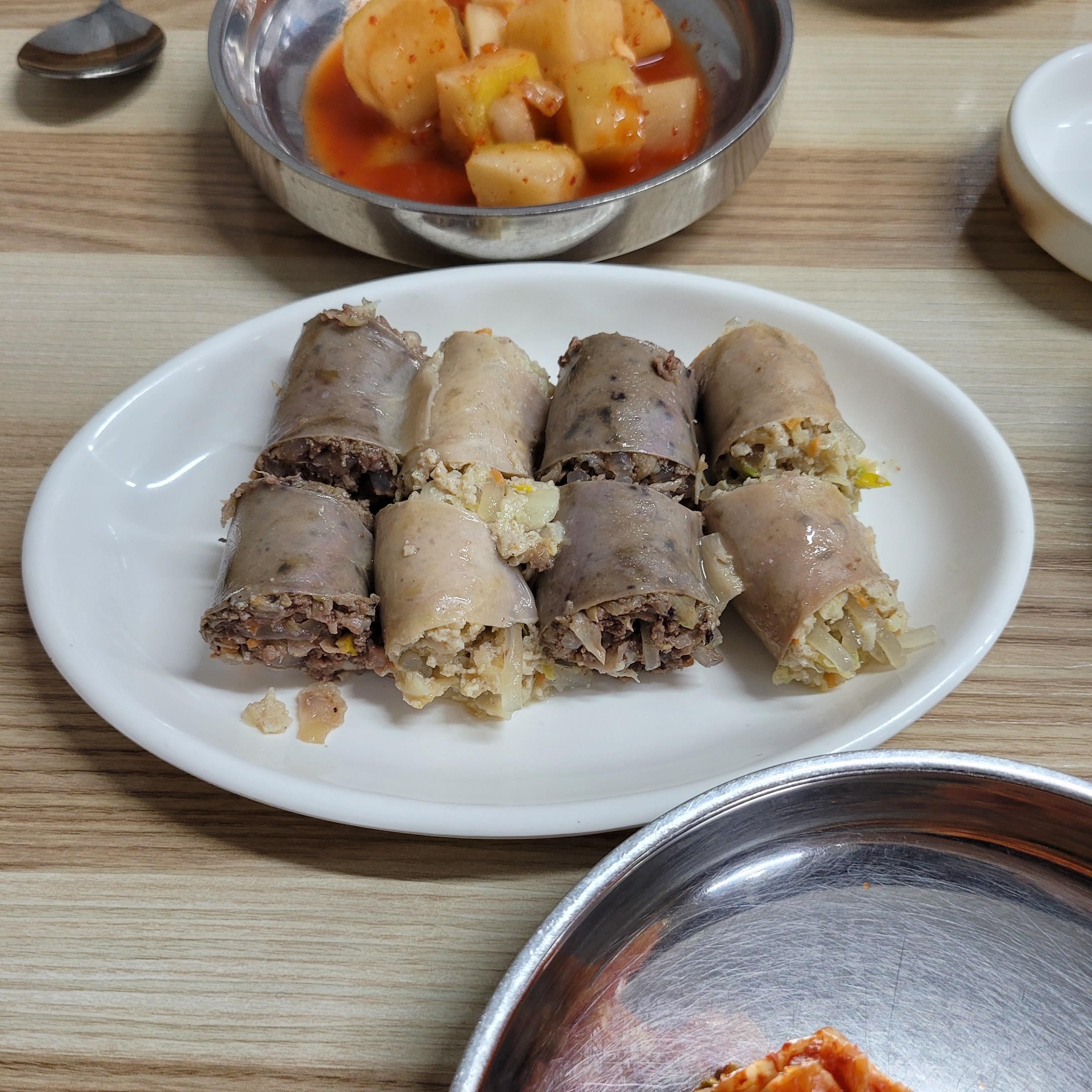 이곳의 순대국밥이다. 순대가 몇 개 들어가 있다. 물에 풀어진 순대보다는 개인적으로 따로 나오는 순대를 소스에 찍어먹는 게 더 맛있는 것 같다. 부추를 넣어 먹는다. 그게 더 풍미가 살아있는 느낌이 든다.