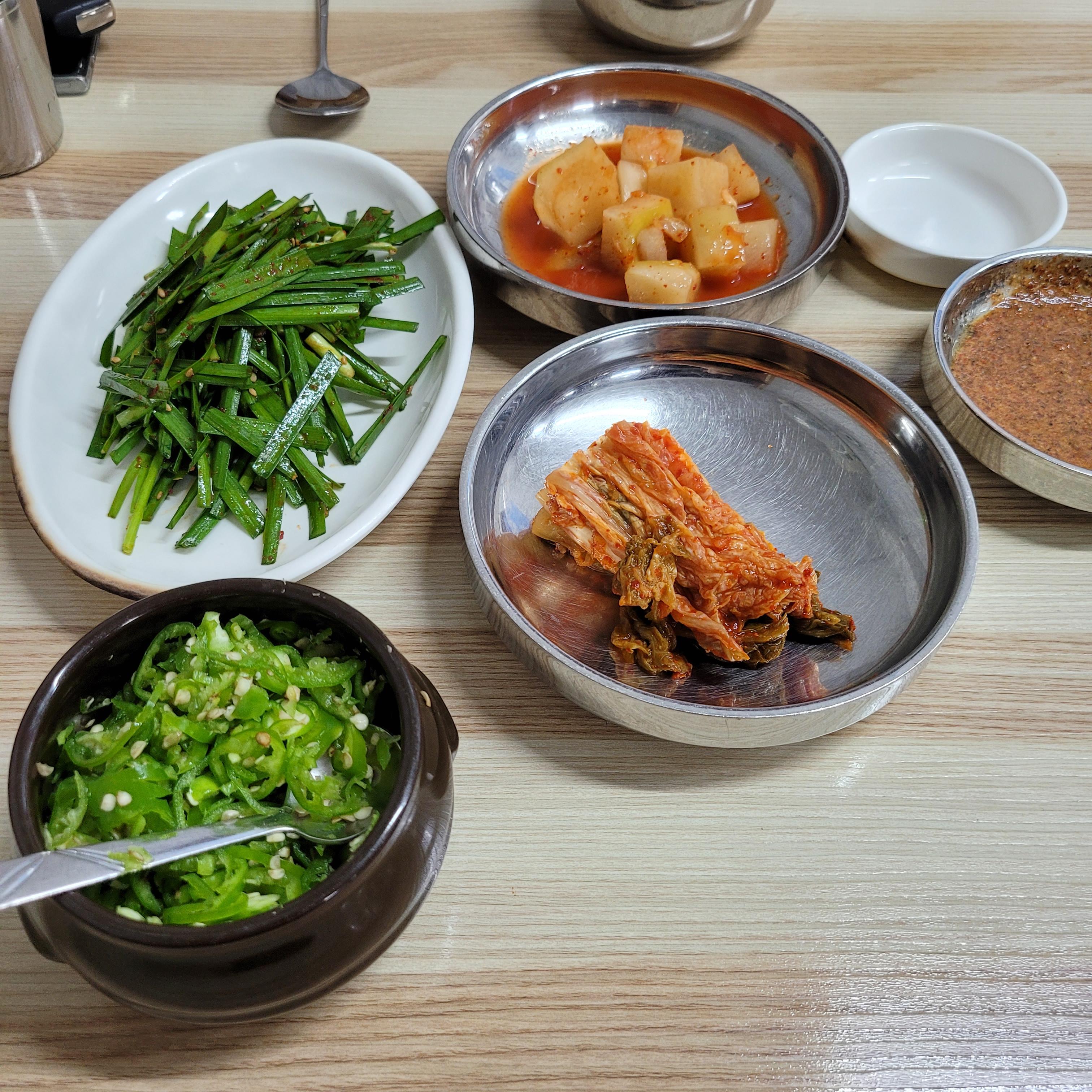 밑반찬들이다. 왼쪽 사진에 저 가운데 있는 소스를 순대에 찍어먹으면 극락 갈 수 있다. 추천한다.